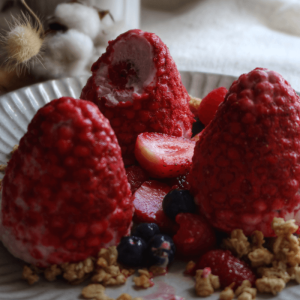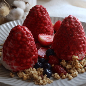 - Unmould carefully, coat with freeze dried strawberries and serve with macerated berries and granola.
